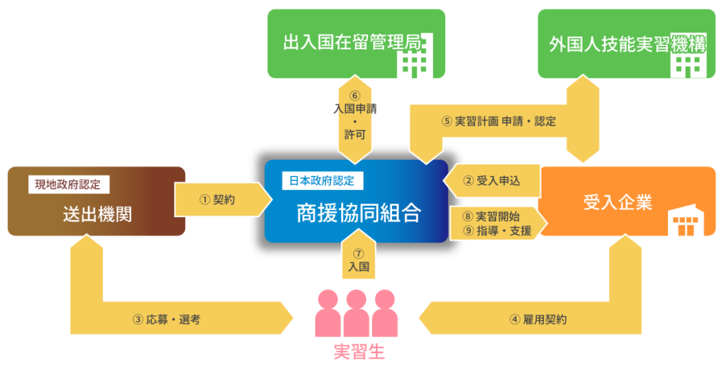 外国人技能実習制度とは、我国で培われた技能、技術又は知識の開発途上地域等への移転を図り、その地域の経済発展を担う「人づくり」に寄与することを目的としています。期間は最長5年とされ、外国人の技能実習生が日本の受入企業と雇用関係を結び、技能実習計画に基づいて技能等の取得を行います。受入を希望される企業様より、職種(別ページ参照)、人数、雇用条件等をお伺いし、海外の送出機関にて選考を行います。候補者の決定と並行して、技能実習計画申請を行うための書類作成をサポートさせていただきます。実習計画の認定後、入国許可を得て実習生は日本に入国いたします。その後約1ヶ月間の日本語研修を行い、受入企業での実習開始となります。当商援協同組合は監理団体として、海外の送出機関との候補者調整や、国の機関である外国人技能実習機構及び入国管理局への各種申請手続き、入国後の技能実習生と受入企業のサポートを行います。